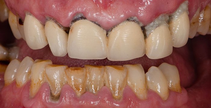 Затем воспаление может распространиться ниже десны и вдоль корней зубов, что может привести к необратимому повреждению тканей («пародонтальной связки») вокруг зубов и опорной кости. Зубы начинают расшатываться и, в итоге, могут быть потеряны.