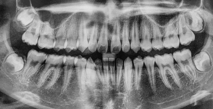 В самых простых случаях необходимы только два снимка (так называемые изображения «прикус-крыло»), но в более обширных случаях может потребоваться до 14 дополнительных рентгеновских снимков и/или панорамный рентгеновский снимок всего рта. Эти рентгеновские снимки показывают челюстную кость, окружающую зуб, и позволяют оценить тяжесть потери костной массы. На каждом рентгеновском снимке, сделанном в стоматологической практике, зубы должны проверяться на наличие кариеса и периодонтита.