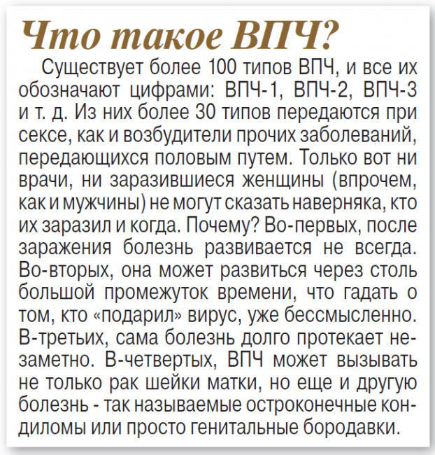 Прививка против вируса папилломы человека (ВПЧ) защищает не от банальной инфекции, а от рака. Эти вирусы вызывают рак шейки матки и еще несколько видов злокачественных опухолей, среди которых рак анальной области, влагалища, глотки, а также области мягкого неба, основания языка и миндалин и, возможно, рак кожи (особенно в области губ, носа, глаз, ногтей).