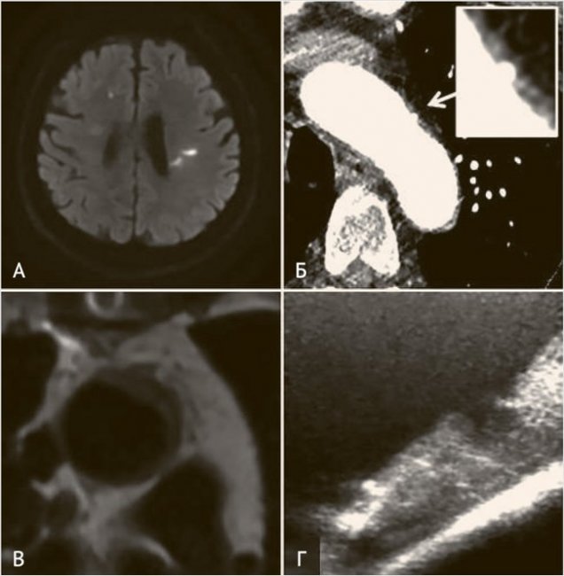 Пример паттерна острых инфарктов на DWI МРТ (А) у пациента с атеромой дуги аорты, выявленной при проведении КТ-аортографии (Б). Пример атеромы дуги аорты на МРТ аорты с ЭКГ-синхронизацией (В) и интраоперационном эпиаортальном УЗИ (Г) при выполнении кардиохирургической операции.