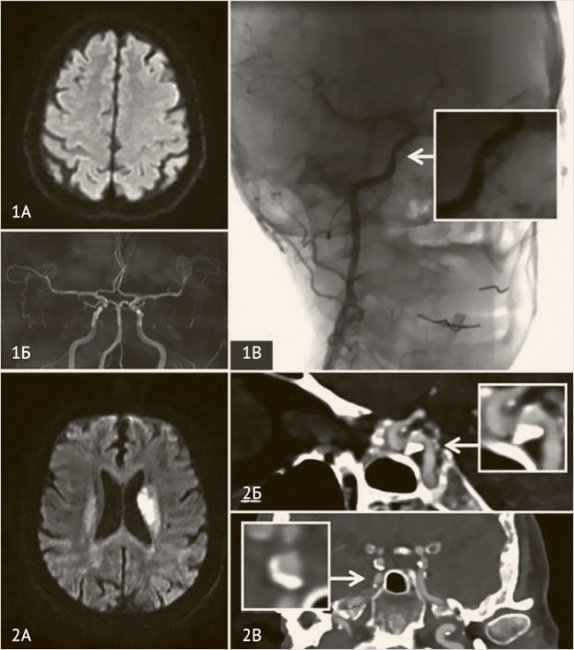 Пациентка, 58 лет, поступила в клинику с левосторонним гемипарезом. Проведен внутривенный тромболизис с положительным клиническим эффектом, очаг инфаркта на DWI МРТ (1А) не сформировался. 3D-TOf МРангиография (1Б) в норме, другие большие источники эмболии исключены. По результатам селективной дигитальной ангиографии выявлен стеноз сегмента С6 правой внутренней сонной артерии 30% по методу WASID (1В), расцененный как симптомный. Пациент, 62 года, перенес ишемический инсульт в бассейне левой средней мозговой артерии (2А). По данным КТ-ангиографии выявлена бляшка сегмента С5 внутренней сонной артерии слева (2Б, 2В), которая из-за феномена позитивного ремоделирования стенозирует просвет артерии на 40% (WASID); других больших источников эмболии выявлено не было.