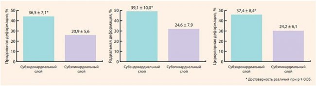 При анализе гистограмм плотности распределения значений продольной, радиальной, циркулярной деформации субэндокардиального и субэпикардиального слоев миокарда отмечались статистически значимо более высокие показатели деформации в субэндокардиальном слое миокарда по сравнению с субэпикардиальным слоем (рис. 5).
