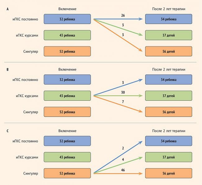 Из группы 2 (интермиттирующие иГКС) сохранили терапию без изменений 30 (69,8%) детей, при этом трех пациентов перевели в группу постоянных иГКС и семерых – в группу Сингуляра (рис. В). В группе 3 (Сингуляр) самая большая доля пациентов сохранила базисную терапию – 46 (88,5%) детей; трое детей потребовали постоянных иГКС и четверо – интермиттирующих курсов иГКС (рис. С).