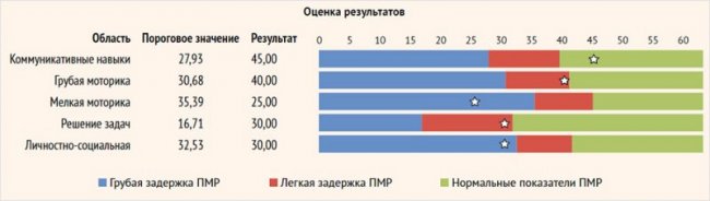 Оценка ПМР проводилась с использованием валидизированной методики «Ages and Stages» через 6 мес. и более после лечения [15]. Содержание методики: оценка показателей ПМР складывалась из дискретной оценки пяти сфер развития: коммуникативных навыков, грубой и мелкой моторики, решения задач и социальных навыков. С использованием оценочной шкалы проводилась стандартизированная оценка пяти сфер психомоторного развития. Для каждого теста, соответствующего определенному возрасту, имелась градация суммы набранных баллов по каждой сфере ПМР: «белая зона» – нормальные показатели ПМР, «серая зона» – умеренная задержка ПМР, «черная зона» – грубая задержка ПМР (рис. 1).