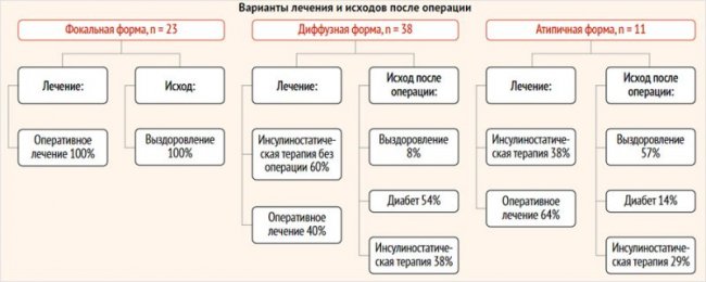 Среди пациентов с ВГИ, включенных в исследование, 32% (23 чел.) пациентов имели фокальную форму заболевания, диффузная форма была обнаружена у 53% (39 чел.) больных, атипичная – у 15% (11 чел.). Медиана возраста детей, включенных в исследование, составила 10 [1–58] мес. Все пациенты с фокальной формой получили хирургическое лечение, в исходе которого у 100% имело место выздоровление, что было констатировано по данным гликемического контроля. Консервативное лечение проводилось у 60% пациентов с диффузной формой заболевания и у 36% пациентов с атипичной формой. Оперативное лечение получили 40% пациентов с диффузной формой и 64% пациентов с атипичной формой. Среди пациентов с диффузной формой, получивших оперативное лечение, 8% больных в исходе имели выздоровление, 54% – сахарный диабет, 38% – рецидив заболевания и возобновление инсулиностатической терапии. В исходе 57% детей с атипичной формой заболевания, получивших оперативное лечение, имели выздоровление, 14% – диабет, 29% – возобновление инсулиностатической терапии (рис. 2).
