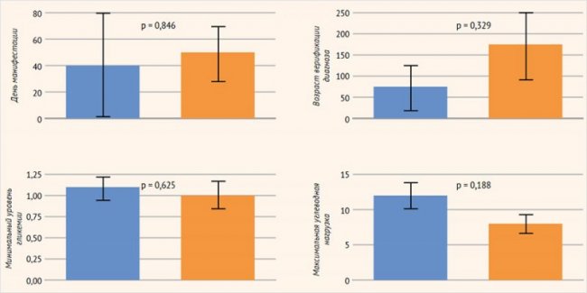 Минимально зафиксированный уровень гликемии <1 ммоль/л, (%, чел.) | 60 (6/10) | 40 ( 10/23) | 0,76 | 1 | 0,38 |
