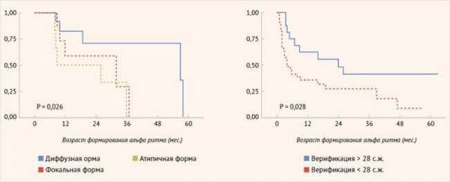 Иные результаты были получены при анализе сроков формирования альфа-ритма. У пациентов с фокальной формой возраст возникновения альфа-ритма был более ранним, а следовательно, более физиологичным по сравнению с пациентами с нефокальными формами ВГИ. Была выявлена прогностическая значимость фокальной формы ВГИ в отношении формирования альфа-ритма (р = 0,026). Кроме того, была установлена ассоциация возраста верификации диагноза с формированием альфа-ритма: чем раньше был установлен диагноз, тем раньше формировался альфа-ритм (р = 0,028) (рис. 5).