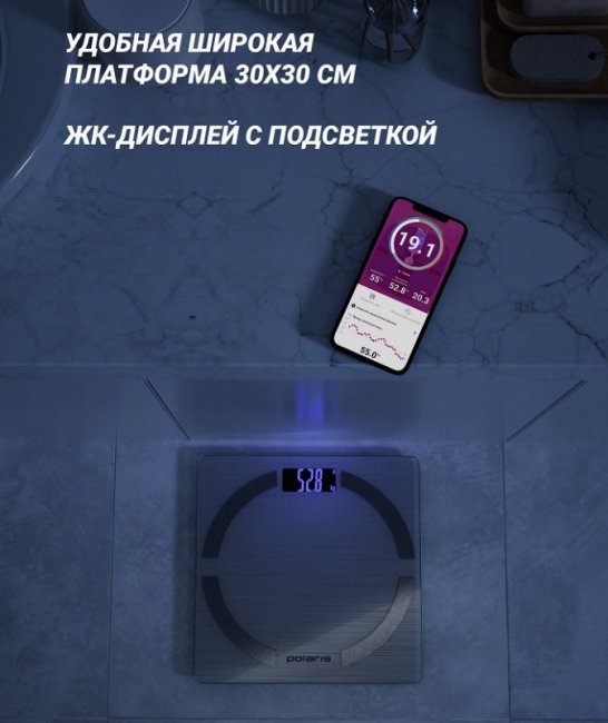 Гаджет фиксирует изменения по всем характеристикам, которые будут всегда под рукой в смартфоне. Умные весы синхронизируются со смартфоном по Bluetooth и сохраняют все данные в приложении Polaris IQ Home.