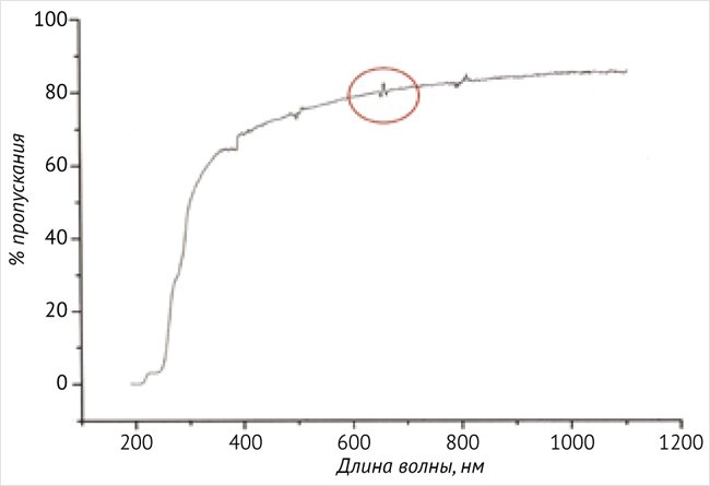 По полученным результатам волны в диапазоне от 600 до 800 нм лучше всего проникают через силиконовый диск. Величина проникновения составляла 80%. При лечении использовалась длина волны лазерного излучения 632,8 нм (рис. 1). Коэффициент отражения гелий-неонового лазерного излучения от барабанной перепонки составляет не более 2% при условии, что угол падения не превышает 30–40°. При соблюдении вышеуказанных условий барабанной перепонки достигает 78–80% излучения лазерного источника.