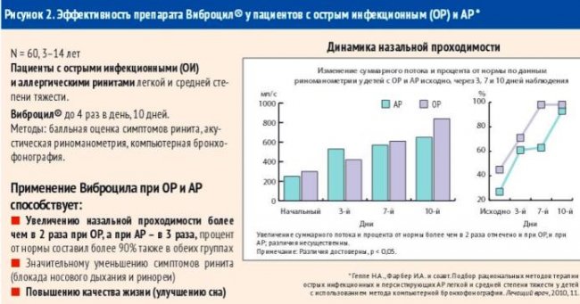 Применение Виброцила при рецидиве аллергического ринита показало высокую его клиническую эффективность, характеризующуюся быстрым купированием симптомов заболевания [2]. При этом опыт использования препарата в строгом соответствии с официальными рекомендациями (короткий курс, возрастной режим дозирования), свидетельствует о его хорошей переносимости.
