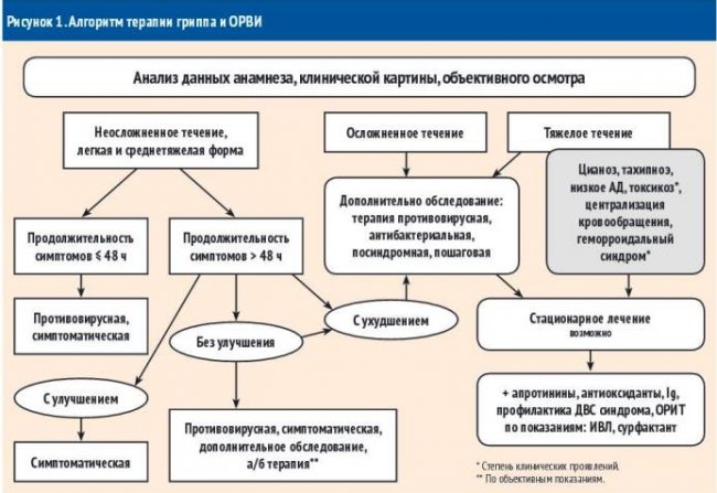 Предложена схема принятия решения у постели больного в помощь практическому врачу в выборе терапии гриппа и ОРВИ (рис. 1).