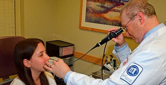 - Введение в нос окрашенного раствора, который виден в глотке.