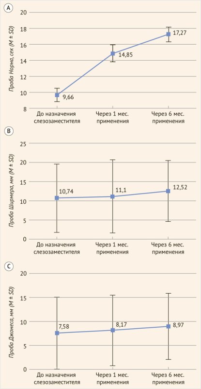 Через месяц применения слезозаместителя Гилан® Экстра, по результатам проведенного нами опроса, все пациенты отмечали снижение частоты и выраженности субъективных жалоб, характерных для ССГ. Повреждение глазной поверхности выявляли в 49% случаев (степени I–III). Через 6 мес. применения слезозаместителя у пациентов, длительно использовавших препараты с БХ, наблюдались лишь единичные жалобы на незначительное жжение и ощущение инородного тела, что свидетельствует о положительной динамике на фоне терапии. По данным биомикроскопического исследования была отмечена тенденция к снижению выраженности гиперемии конъюнктивы и уменьшению признаков фолликулеза, которые практически исчезли через 6 мес. применения слезозаместителя. В 89% случаев на фоне использования глазных капель Гилан® Экстра нами было отмечено значительное улучшение состояния эпителия глазной поверхности с отсутствием признаков его прокрашивания витальным красителем. В 11% случаев наблюдали дефекты эпителия степени I (по Оксфордской системе). Кроме того, на фоне слезозаместительной терапии отмечена положительная динамика в отношении функциональных проб (таблица). После 1 мес. применения слезозаместителя Гилан® Экстра было отмечено достоверное увеличение показателей пробы Норна более чем в 1,5 раза относительно исходных данных – 14,85 ± 4,52 сек. Через 6 мес. проба Норна превысила исходные значения в 2 раза и составила 17,27 ± 3,95 сек (p < 0,001). Кроме того, нами было отмечено достоверное увеличение показателей пробы Ширмера: через месяц инстилляций слезозаместителя значение выросло на 3,4% и составило 11,1 ± 4,83 мм, а через 6 мес. – на 16,6% относительно исходных значений и достигло 12,52 ± 4,04 мм (p = 0,039). Средние показатели пробы Джонеса также имели тенденцию к увеличению, однако не были статистически значимы. Через 1 и 6 мес. применения слезозаместитля Гилан® Экстра показатели увеличились на 7,8 и 18,3% соответственно (p = 0,068). Графически результаты функциональных проб представлены на рис. 1.