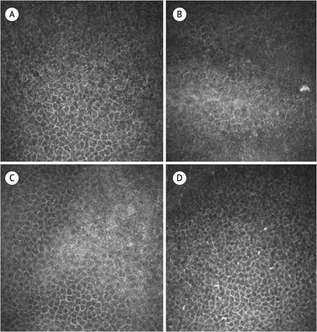 А – конфокальный снимок эпителия роговицы в норме; B – конфокальный снимок эпителия роговицы до начала слезозаместительной терапии; С – конфокальный снимок эпителия роговицы через 1 мес. после начала слезозаместительной терапии; D – конфокальный снимок эпителия роговицы через 6 мес. после начала слезозаместительной терапии.