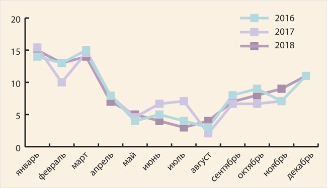 Рисунок 3. Внесение данных о пациентах с тяжелой внебольничной пневмонией в систему по месяцам за 2016–2018 гг.