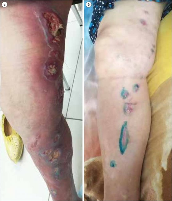 Рисунок. Состояние левой нижней конечности на момент обращения пациента в медицинское учреждение (а) и спустя 3 мес. от начала лечения (б)