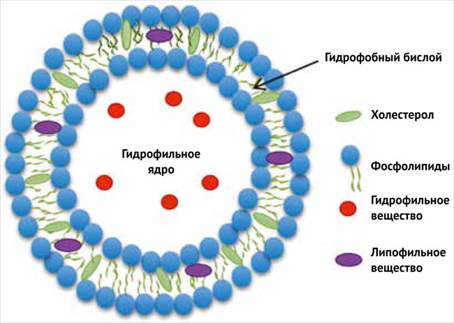 Основным компонентом липосом, формирующим их оболочку, являются фосфолипиды, амфифильные соединения, имеющие гидрофобный хвост и гидрофильную головку. Фосфолипиды обладают способностью самопроизвольно образовывать в воде бислойные мембраны. Внутри липосомы находится так называемое гидрофильное ядро – полость, заполненная водой [31, 36]. Липофильные вещества вводят в липидный бислой, а гидрофильные – в гидрофильное ядро (рисунок).