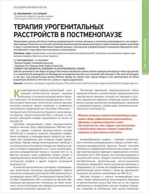 Представлены данные об этапах старения репродуктивной системы женщины и симптомах, развивающихся в эти возрастные периоды. Отмечено, что в основе патогенеза развития урогенитальных расстройств лежит снижение уровня эстрогенов в пери- и постменопаузе. Эффективной терапией женщин с вагинальной атрофией является назначение препаратов эстриола (Овестин) в виде крема или вагинальных суппозиториев.