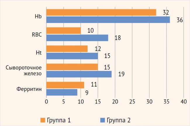 2. Уровень гемоглобина пациенток – 90–110 г/л, эритроциты – 3,3–3,7, гематокрит – 30,5–35%, ферритин – ≤20 мкг/л, сывороточное железо – менее 12,5 мкмоль/л.