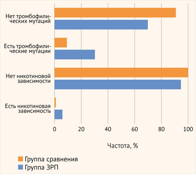 При анализе соматического анамнеза было установлено, что массо-ростовые показатели и индекс массы тела (ИМТ) в группе с задержкой роста плода были статистически значимо меньше, чем в группе сравнения (p = 0,005, p < 0,001, p = 0,003 соответственно). Анализ наследственного анамнеза показал, что частота встречаемости сахарного диабета (СД) 2-го типа в группе с задержкой роста плода была выше в 1,8 раза по сравнению с группой сравнения (95% ДИ: 1,04–3,13). Следует отметить высокую частоту тромбофилических мутаций, частота которых в основной группе была выше в 4,2 раза (95% ДИ: 2,11–8,39) и составила 30,2% (у каждой третьей женщины), а тромбофилические мутации низкого риска в данной группе выявлялись в 7,5 раза чаще, чем в группе сравнения (95% ДИ: 2,89–19,37) – 24,9 и 6,8% (по группам соответственно). Также установлено, что при задержке роста плода достоверно чаще (p = 0,05) отмечалась хроническая никотиновая интоксикация – 5,9 и 0,5% (соответственно для группы ЗРП и группы сравнения) (рис.).