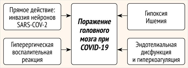 Рисунок. Обсуждаемые механизмы поражения головного мозга при COVID-19