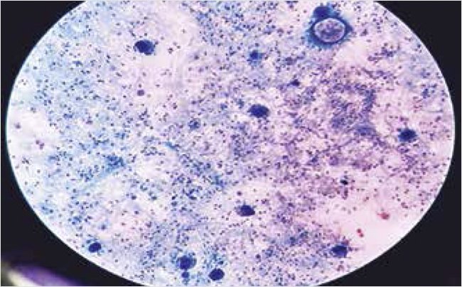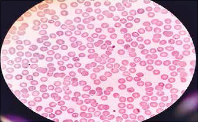 В «толстой» капле крови при подсчете обнаружено 15 000 паразитов на 100 лейкоцитов. На 2,49 х 109/л (количество лейкоцитов в микролитре крови) паразитемия составила 373 500 в 1 мкл крови («звездное небо»). В препарате определяются мелкие, с разорванной цитоплазмой и характерными формами «комета», «восклицательный знак», «подковообразные» с двумя глыбками хроматина паразитарные клетки на стадии юных трофозоитов (кольцо) P. falciparum. Встречаются единичные развивающиеся (амебовидные) и зрелые трофозоиты (шизонты), что указывает на высокий риск развития тяжелой (осложненной) малярии.