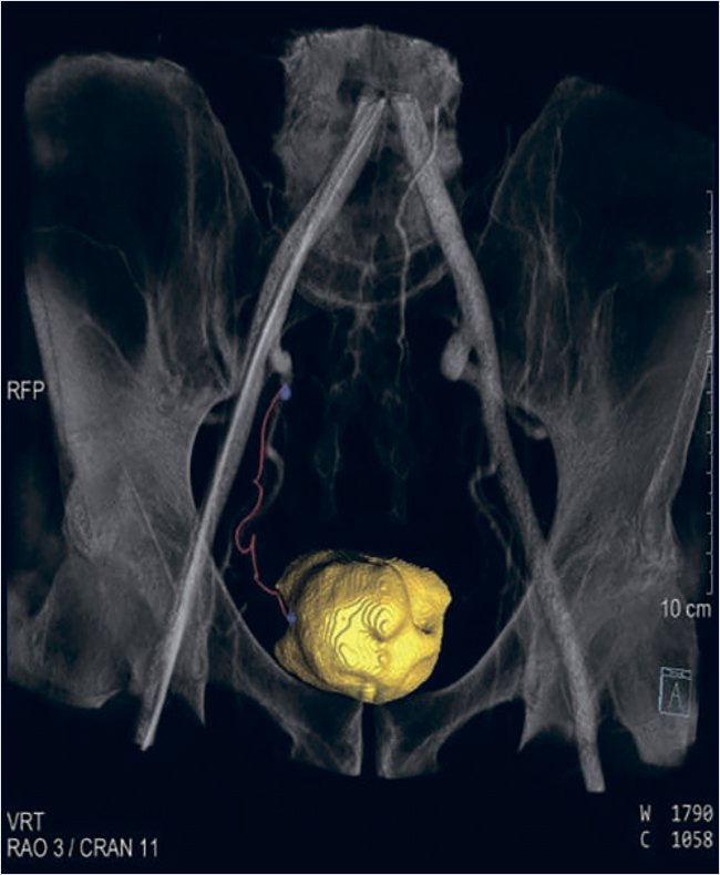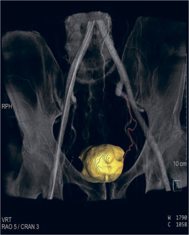 В данном сообщении демонстрируем клинический случай эмболизации простатических артерий у пациента с доброкачественной гиперплазией предстательной железы с применением технологий наложения цифровой визуализации для детального определения сосудистой анатомии малого таза и верификации простатических артерий.
