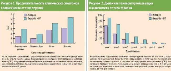 С целью оценки эффективности и переносимости препарата Ингарон при интраназальном способе введения для профилактики гриппа и других ОРВИ у взрослых в ФГБУ «НИИ гриппа» Минздрава России проведено рандомизированное, плацебо-контролируемое исследование. Курс профилактики включал в себя два десятидневных цикла с интервалом в одну неделю. В течение 10-дневного цикла препарат Ингарон применяли через день интраназально по 2-3 капли в каждый носовой ход, всего в течение 2 циклов -- 10 раз. Результаты исследования показали, что профилактический курс приема препарата Ингарон обеспечил достоверное снижение частоты возникновения ОРВИ в основной группе. Кроме того среди лиц, получавших препарата Ингарон с профилактической целью было отмечено более легкое течение развившихся ОРВИ и уменьшение числа осложненных форм в 1,9 раз, а длительность течения неосложненного ОРВИ была на 1,5 дня короче, чем в контрольной группе (рис. 1).