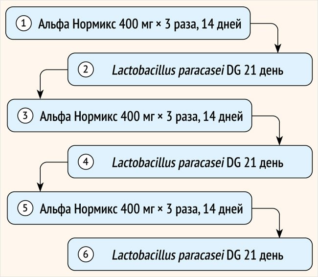 Рисунок. Фармакотерапия. Всего 6 циклов, включая циклично 14-дневный курс рифаксимином-альфа (циклы 1, 3, 5), далее – 3 нед. пробиотиком (циклы 2, 4, 6)