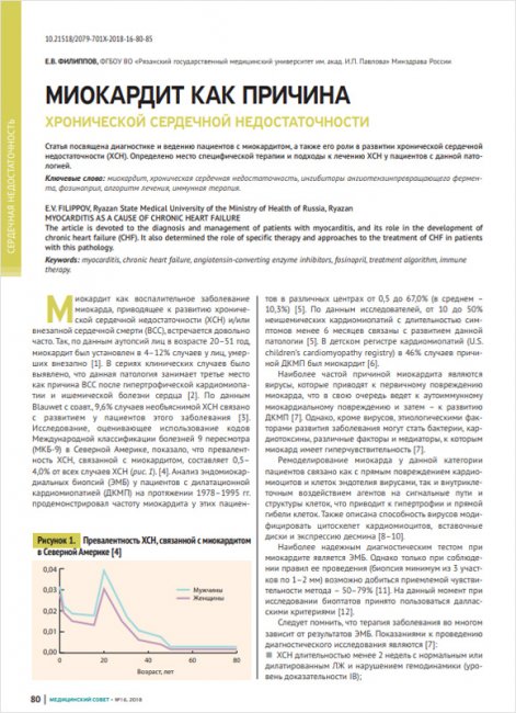 The article is devoted to the diagnosis and management of patients with myocarditis, and its role in the development of chronic heart failure (CHF). It also determined the role of specific therapy and approaches to the treatment of CHF in patients with this pathology.