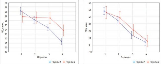 СРБ, мг/л, на 10-е сут. | 6,1 | 2,3–9,3 | 8,2 | 2,9–10,3 |
