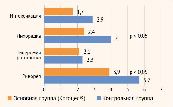 Профилактический прием индуктора интерферона Кагоцел® у детей способствовал ликвидации основных клинических симптомов ОРВИ в среднем ко 2–3-му дню болезни, тогда как у детей контрольной группы – к 3–4-му дню (получена высокая степень статистической достоверности по лихорадочному состоянию и ринорее, р < 0,05).