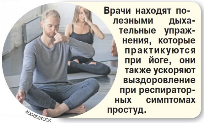 Кроме того, врачи находят полезными дыхательные упражнения, которые практикуются при йоге, они также ускоряют выздоровление при респираторных симптомах простуд.