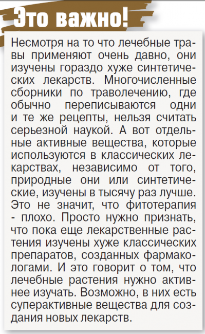 Реальность. Это не так. Концентрация активных веществ в растениях - самое слабое место в фитотерапии. Из-за этого лекарственные травы трудно точно дозировать. Концентрация активных веществ может существенно отличаться в одних и тех же растениях, собранных в разных местах или в разное время, поэтому в фитопрепаратах концентрация лечебных компонентов колеблется в больших пределах. А если точное количество их неизвестно, то неизбежны как передозировка активных веществ, так и их недостаток. Это обязательно сказывается на качестве лечения. В этом плане синтетические препараты более предсказуемы, их легче дозировать.