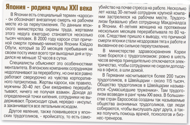 Принято думать, что трудоголизм - это проблема азиатских стран, где по этой причине погибают до 100 тысяч человек в год. А России, где народ страдает скорее от лени, такая напасть не грозит. Но вот статистика говорит, что 82% россиян предпочитают не брать больничный, а приходить на работу нездоровыми. Кому-то нужны деньги, кто-то боится потерять работу. Но сколько среди них тех, кто без работы просто не может? И тяга эта не совсем здоровая.