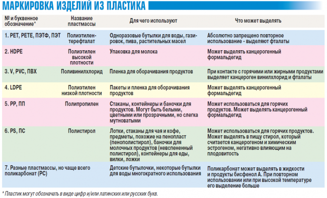 С точки зрения токсичности менее других опасны полиэтилен или полипропилен. Но при контакте с горячим они тоже могут выделять канцероген формальдегид. А вот такие пластические вещества, как полистирол, поливинилхлорид и другие, реально опасны. Они могут выделять серьезные канцерогены, а также фталаты и бисфенол А. Вы можете без труда определить, с каким пластиком сталкиваетесь в том или ином продукте - бутылке с водой, упаковке пищевых продуктов, пластмассовой посуде и т. д. Дело в том, что практически все изделия из пластика имеют маркировку в виде цифр или букв, которую надо уметь читать. Обычно ее указывают внутри треугольничка со стрелками (см. таблицу).