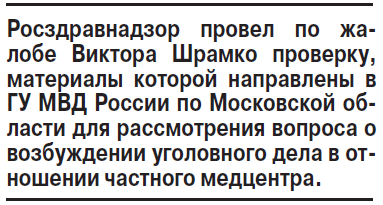 Помощник руководителя территориального органа Росздравнадзора по Москве и Московской области Елена Баландина сообщила «Миру новостей»: «Все материалы нашей проверки, проведенной по жалобе пациента частного медцентра, буквально на днях мы направили в ГУ МВД России по Московской области для рассмотрения вопроса о возбуждении уголовного дела. Мы просим рассмотреть возможность возбудить уголовное дело по статье 327 УК РФ». Эта статья наказывает за подлог документов.