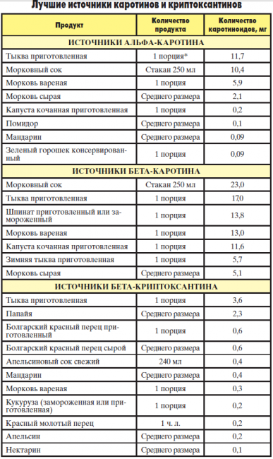 Считается, что из 12 молекул бета-каротина лишь одна идет на производство витамина А. Оставшиеся 11 молекул работают нам на пользу сами по себе. В частности, было показано, что любители продуктов, богатых этим веществом, реже болели раком легких (см. «Это важно»). Передозировка бета-каротином практически безопасна, ее главное проявление - пожелтение кожи, которое больше похоже на загар, чем на желтуху. Но таким же действием провитаминов еще обладают два других менее известных каротиноида - альфа-каротин и гамма-криптоксантин. Они тоже превращаются в витамин А.