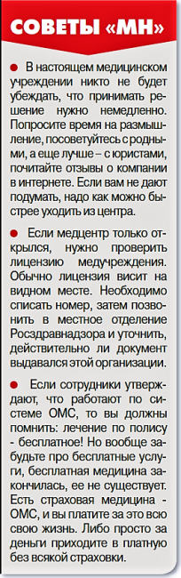 В других случаях психологические приемы были куда проще. Например, врач как бы невзначай начинал разговор о разводах, которые происходят на каждом шагу, о том, что мужья немолодых женщин находят юных любовниц, поэтому надо особенно тщательно следить за собой. После такой беседы пациентки легко заключали договоры не только на медицинские, но и на косметические услуги.