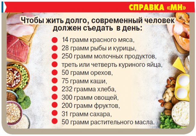 Чтобы жить долго, современному человеку нужно ограничить потребление красного мяса до 14 грамм в день, рыбы и курицы - до 28 грамм, молочных продуктов - до 250 грамм. Также можно съесть треть или четверть куриного яйца, 50 грамм орехов, 75 грамм каши, 232 грамма хлеба, 300 грамм овощей и 200 грамм фруктов, 31 грамм сахара и 50 грамм растительного масла.