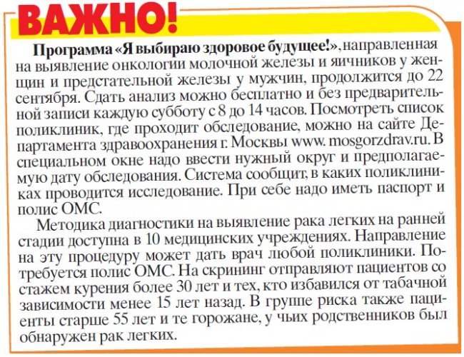 Объявление на сайте столичного мэра попалось на глаза совершенно случайно. Москвичей приглашали в поликлиники пройти скрининг на выявление онкологических заболеваний.