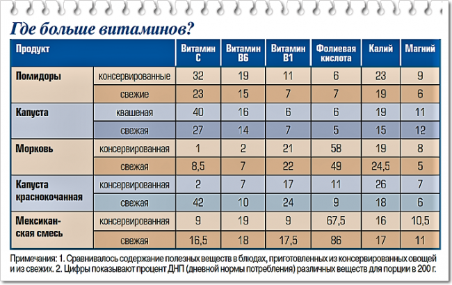 Они провели необычный эксперимент - проверили содержание витаминов и некоторых минеральных веществ в блюдах, сделанных из одинаковых овощей: консервированных и свежих. Парадоксально, но в большинстве случаев в «консервной» еде их было больше (см. таблицу).