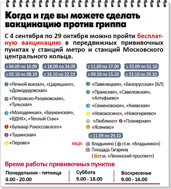 Как и в прошлом году, каждый сможет сделать себе прививку прямо по дороге на работу - мобильные пункты для этого будут открыты около 24 станций Московского метрополитена и 2 станций МЦК. Кампания продлится до 29 октября.