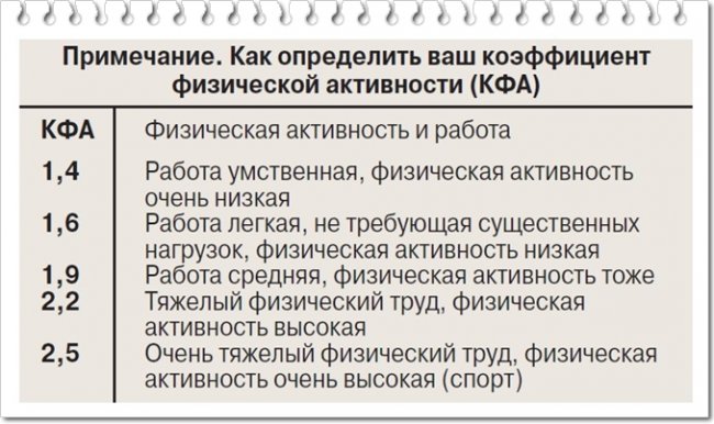 2. Величину основного обмена нужно умножить на так называемый КФА (коэффициент физической активности, см. «Примечание»).