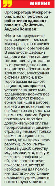 Зачем же огород городить с нормами, если их можно не выполнять? В Минздраве на это есть ответ. Приказ лишь утверждает типовые отраслевые нормы, и адресованы они не практикам, а организаторам здравоохранения и руководителям учреждений, чтобы определять нормирование труда подчиненных, а врач должен принимать пациента столько, сколько необходимо с учетом состояния здоровья пациента. Как хочешь, так и понимай чиновничью логику.