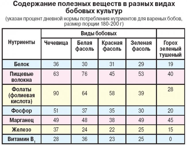 По содержанию калия, кальция, магния, хрома, железа, меди, а также витаминов Е, В1, В6 и ряда других полезных веществ бобовые превосходят многие зерновые культуры. Но вот соотношение кальция и фосфора в них неблагоприятно для усвоения организмом кальция.