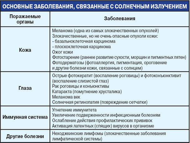 Известно более 20 болезней, возникающих или усиливающихся под действием солнечных лучей (см. «Основные заболевания… »). И связаны они не только с самой кожей. Например, солнечный ультрафиолет может проникать через поверхностные слои и облучать клетки крови, протекающие по внутрикожным капиллярам. В первую очередь страдают клетки иммунной системы, и поэтому сопротивляемость инфекциям может падать. Подсчитано, что за 11 минут через эти мельчайшие сосуды кожи проходит практически вся кровь человека. То есть на пляже или в солярии, когда под солнцем находятся большие поверхности нашего тела, доза облучения может быть весьма существенной.