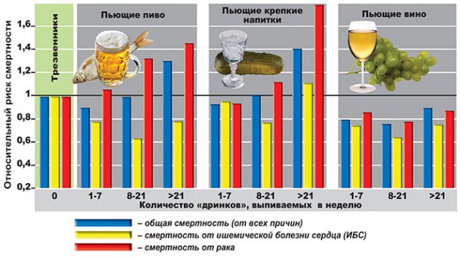 А вот у любителей вина смертность при любом стиле пития всегда ниже. Причем ниже не только чем у пьющих пиво и крепкий алкоголь, но и чем у трезвенников.