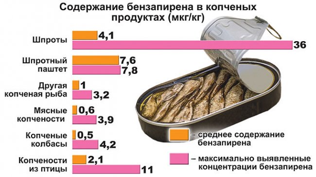 С производством шпрот и прочих копченых рыбных консервов реально существуют серьезные проблемы: при их изготовлении очень легко превышается допустимая концентрация бензапирена. Высокая температура копчения и рыбий жир, особенно расположенный подкожно, способствуют синтезу и накоплению этого канцерогена. Концентрацию бензапирена можно уменьшить, фильтруя дым, увеличивая расстояния между огнем и рыбой, а также своевременно промывая коптильные печи. Понятно, что технология частенько нарушается, и мы всегда будем сталкиваться с канцерогенной рыбешкой.