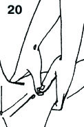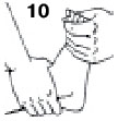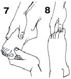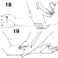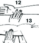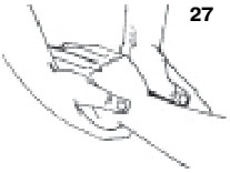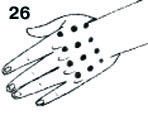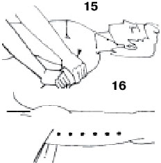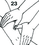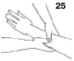 Действие 33. Тыльная сторона предплечья. 8 точек этой области находятся на линии, идущей от наружного конца локтевой складки к промежутку между средним и безымянным пальцами руки. Массажист большими пальцами, наложенными один на другой, надавливает на первую из 8 точек. Она находится на вершине мышечного бугра (рис. 24). Первое давление на эту точку может быть очень болезненным. Каждое надавливание должно длится около 5 сек. Действие необходимо повторить трижды (рис. 25).